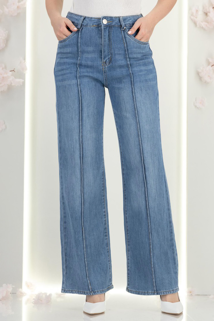 Blugi albaștri realizați din denim rezistent, ideali pentru ținute casual confortabile și ușor de asortat. Modelul are talie înaltă, care evidențiază talia și oferă o potrivire plăcută pe siluetă.