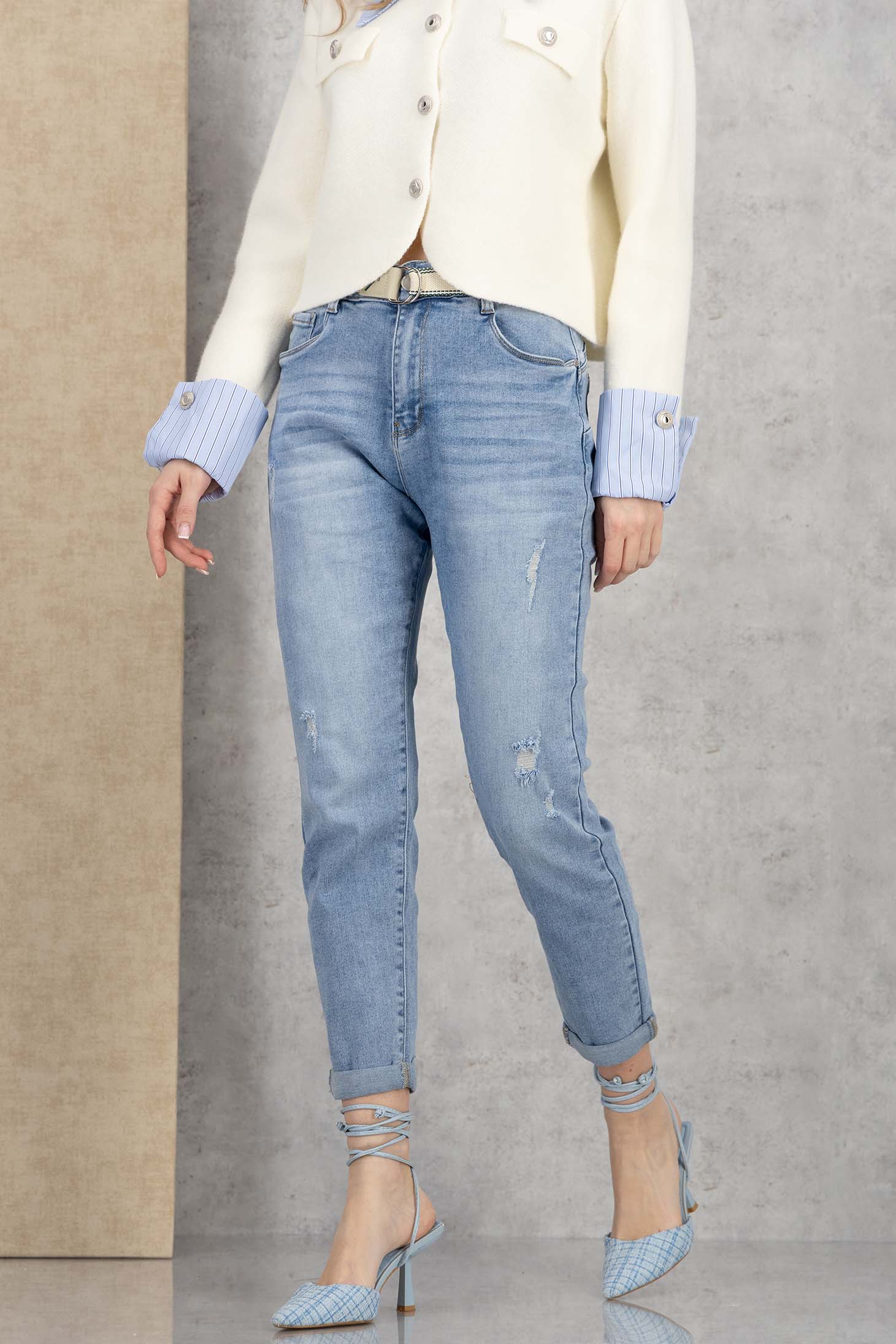 Acești blugi lungi albastri, de tip Mom Fit, sunt confecționați din bumbac (denim), un material durabil și confortabil. Talia înaltă oferă un look modern și subliniază linia taliei, fiind perfectă pentru un stil casual și relaxat. Sistemul de închidere frontal, format dintr-un fermoar și un nasturel, asigură o ajustare perfectă și un design simplu, dar elegant. Blugii sunt accesorizati cu o curea decorativă în talie, care adaugă un detaliu stilistic suplimentar și completează ținuta. Aceștia dispun de buzunare frontale și la spate, oferind atât funcționalitate, cât și un aspect practic. Acești blugi Mom Fit sunt ideali pentru o ținută casual, fiind ușor de combinat cu diverse topuri și încălțăminte pentru un look relaxat și chic.