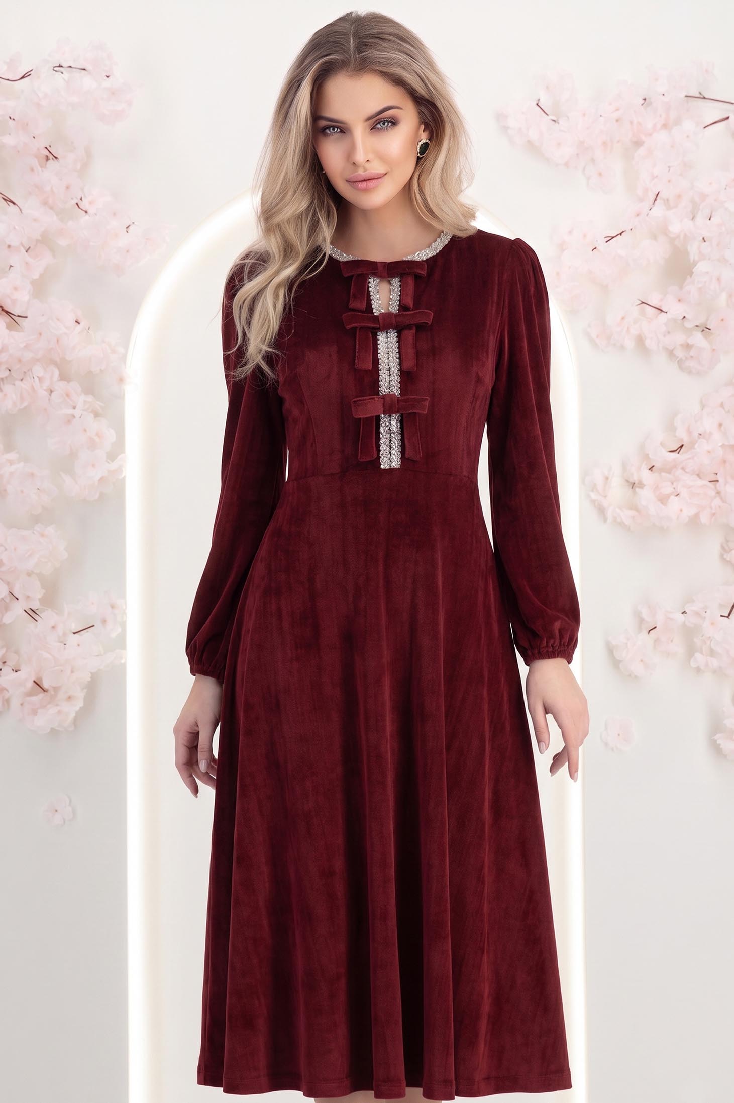Rochie din catifea visinie midi in clos accesorizata cu fundite si pietre strass frontal