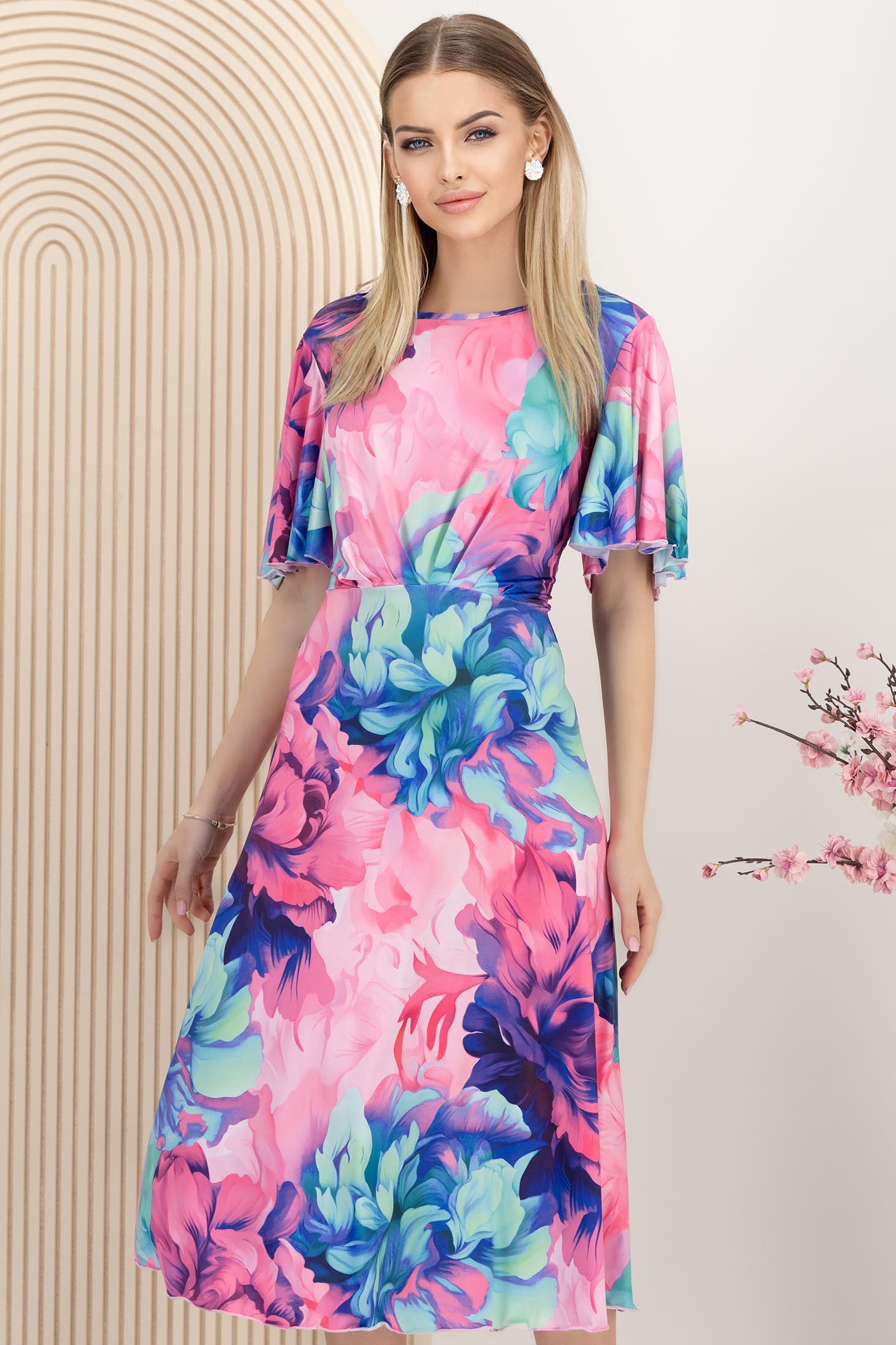 Rochie din lycra roz midi in clos cu maneca tip fluture imprimata floral