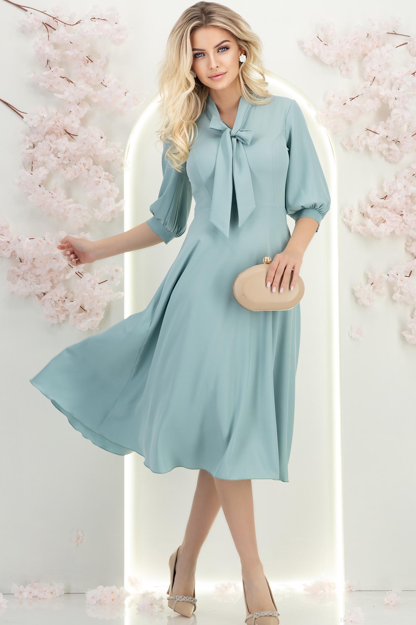 Rochie din material fluid mint midi in clos cu guler tip esarfa - StarShinerS